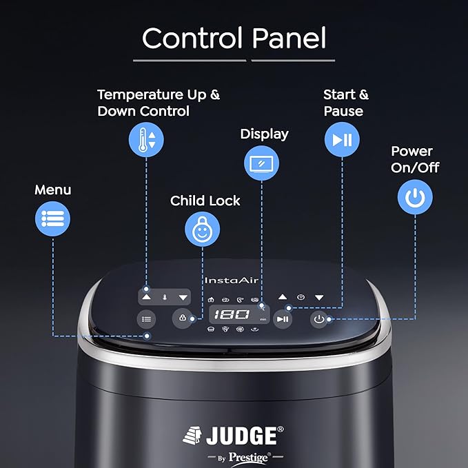 Judge by Prestige InstaAir Digital 4L Air Fryer | 80% less Oil Consumption | Air Fry, Grill, Roast, Bake | Digital Display | 8 Preset Menu | 1250 Watts | Easy to Clean | 1Y Warranty | ISI Certified